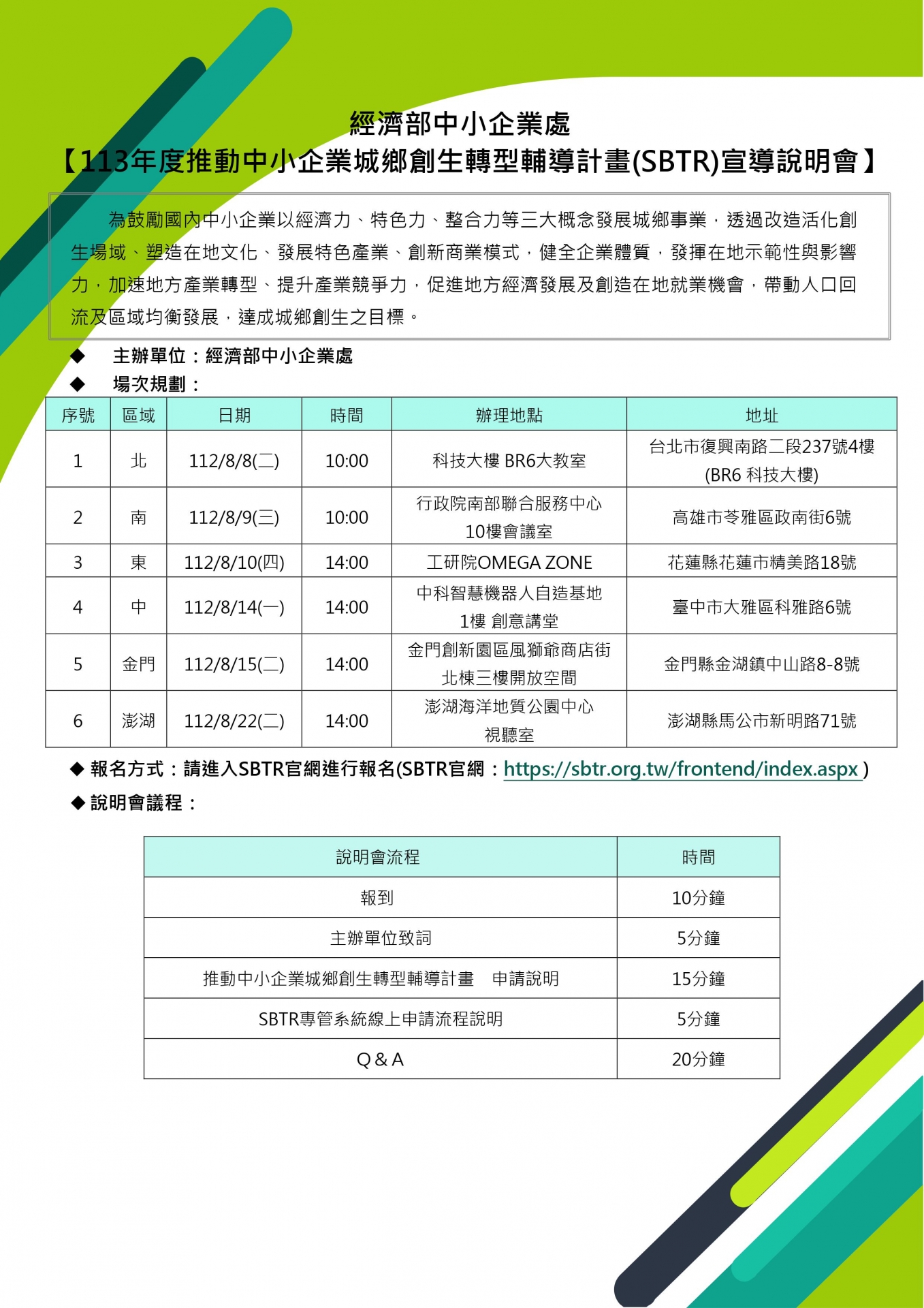 計畫資訊及說明會時程詳見官網:https://sbtr.org.tw/frontend/index.aspx