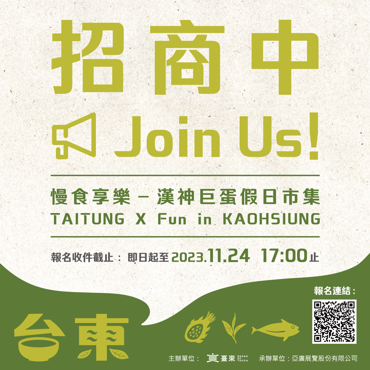 臺東縣政府辦理「慢食享樂-漢神巨蛋假日市集」,歡迎臺東在地優質業者報名參加~ + + + + + + + + | 慢食享樂-漢神巨蛋假日市集 | 市集日期:2023年12月16日(六)至12月17日(日),共2天 市集地點:漢神巨蛋購物廣場2F 報名連結:https://forms.gle/aTsKHSoM2dRvLmiw5