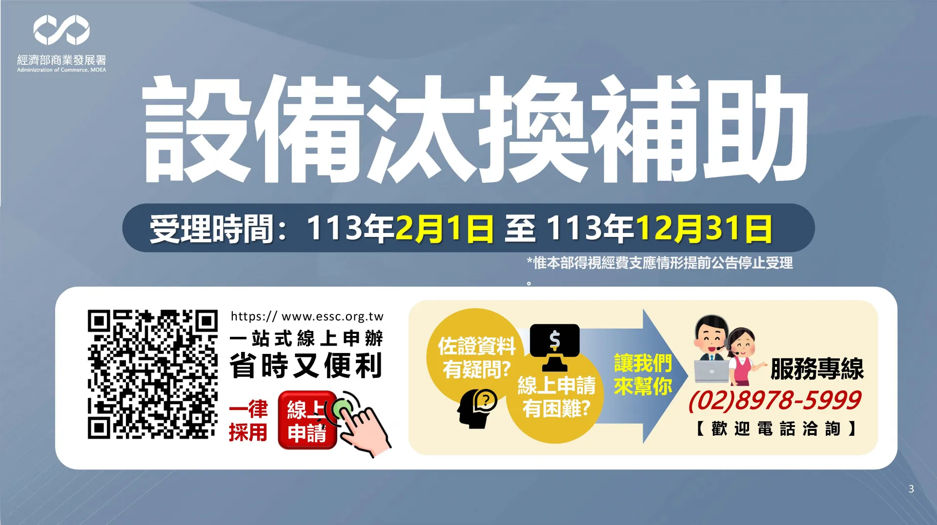 有關補助內容與申請規範,可至計畫網站(https://www.essc.org.tw)查閱懶人包、補助要點、常見問答集等資訊,亦可撥打服務專線02-8978-5999洽詢。本補助受理期間自113年2月1日起至113年12月31日止,採全線上申請,省時又便利,還可以透過進度查詢功能,隨時掌握案件處理進度。商業發展署表示,若補助經費用完,將提前公告停止受理,所以要請企業儘早提出申請,以免向隅。