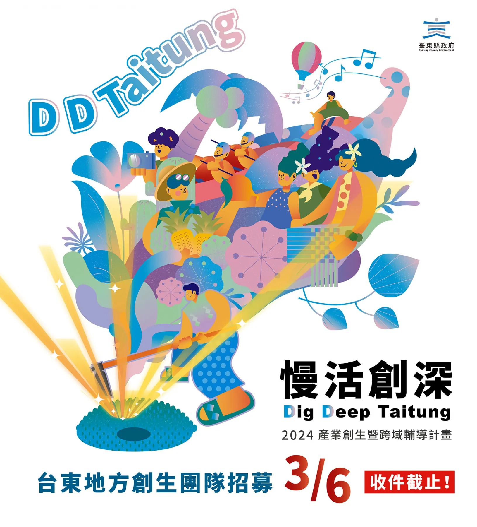 Dig Deep Taitung 慢活創深,以地方創生永續經營理念為出發,透過整合「地」、「產」、「人」資源,並找出地方產業DNA的、萃取臺東三個主題關鍵字:「朋友」、「風土」、「Moments」,深度挖掘屬於臺東慢的「真、善、美」。