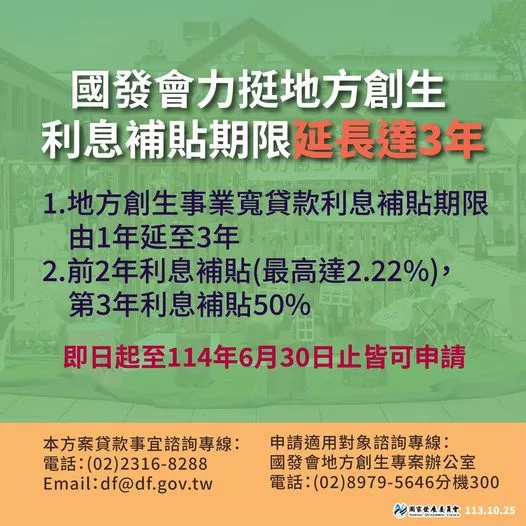 ♦國發基金透過「放寬方案適用對象」、「利息補貼」、「10成信用保證」及「信保手續費政府出」等4大措施,協助地方創生事業取得受天災影響復甦所需的資金,貸款利息補貼期限由1年延至3年,前2年利息補貼(最高達2.22%),第3年利息補貼50%,地方創生事業至114年6月30日止皆可申請。