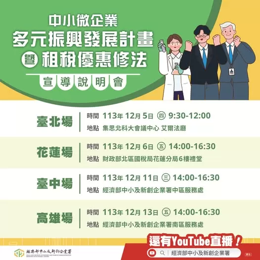 行政院推動「中小微企業多元振興發展計畫」,透過「3策略、3配套、1窗口」,以最簡便、直接的方式協助中小微企業的多元振興及持續發展,透過北、中、南、東4場實體說明會及YouTube線上直播,帶您一次瞭解計畫內容!