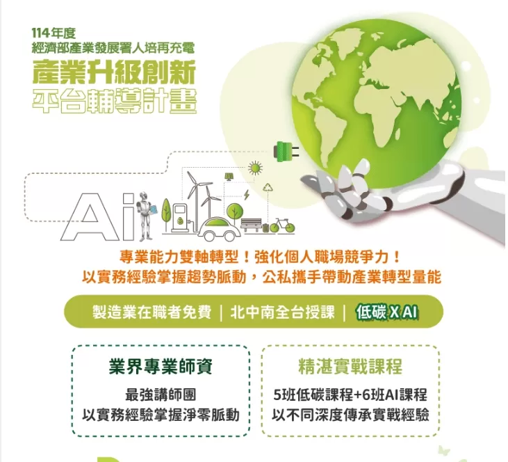 經濟部產業發展署辦理「114 年度產業升級創新平台輔導計畫」 以大帶小製造業低碳及智慧化升級轉型補助人培再充電專案計畫,於 4 月 29 日起至 8 月 6 日,於臺北、臺中、臺南等地辦理系列培訓課程共計 11 場。