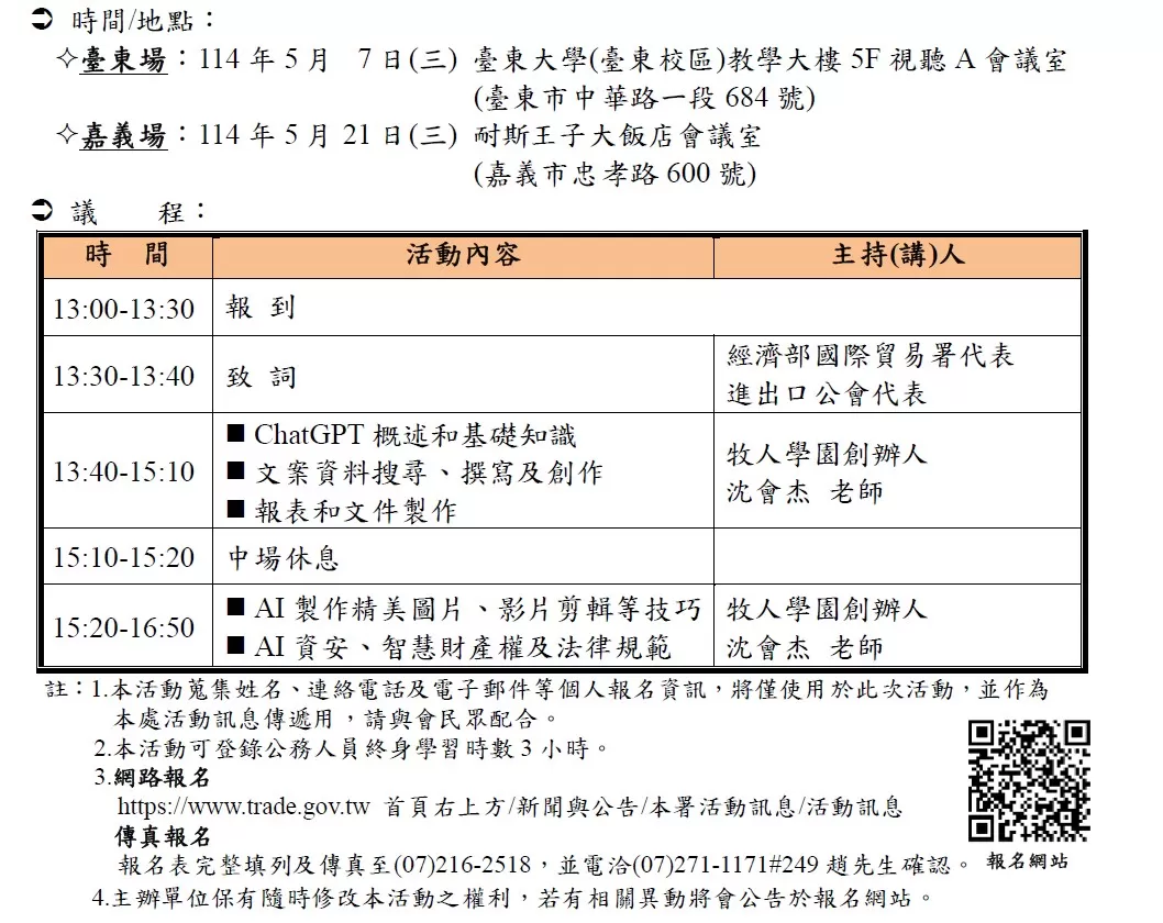 為協助企業掌握 AI 行銷的最新實務應用與法規趨勢,經濟部國際貿易署特舉辦本次說明會,邀請業界專家深入解析 AI 在行銷領域的創新應用、法規動向及企業應對策略,助您掌握商機、邁向成功。