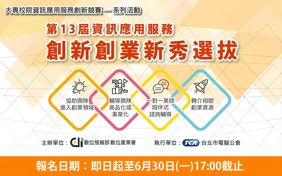 數位發展部數位產業署舉辦的「資訊應用服務創新創業新秀選拔」,致力於扶植具潛力的團隊與初創企業,提供專業諮詢與資源媒合,幫助你加速邁向創業之路